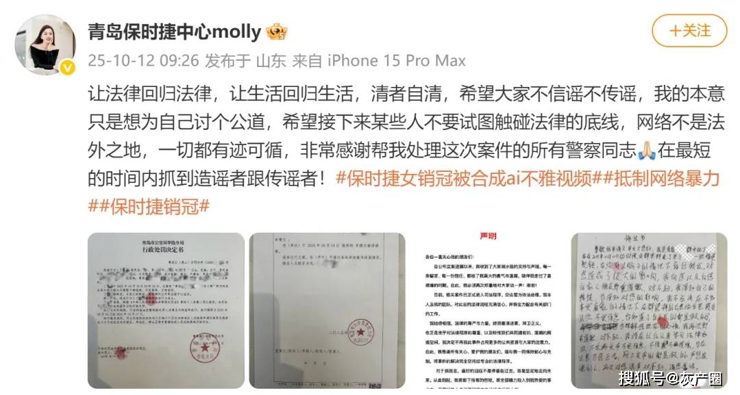 10月12日,青岛保时捷女销冠牟女士晒出的一份行政处罚决定书显示,某男子在群内转发其照片图文并搭配不雅视频,对其侮辱,被处以行政拘留五日。此前,牟女士因两次成为保时捷年度销冠登上热搜,网上出现由AI恶意合成的虚假视频和不良视频,对其进行诽谤和侮辱。
