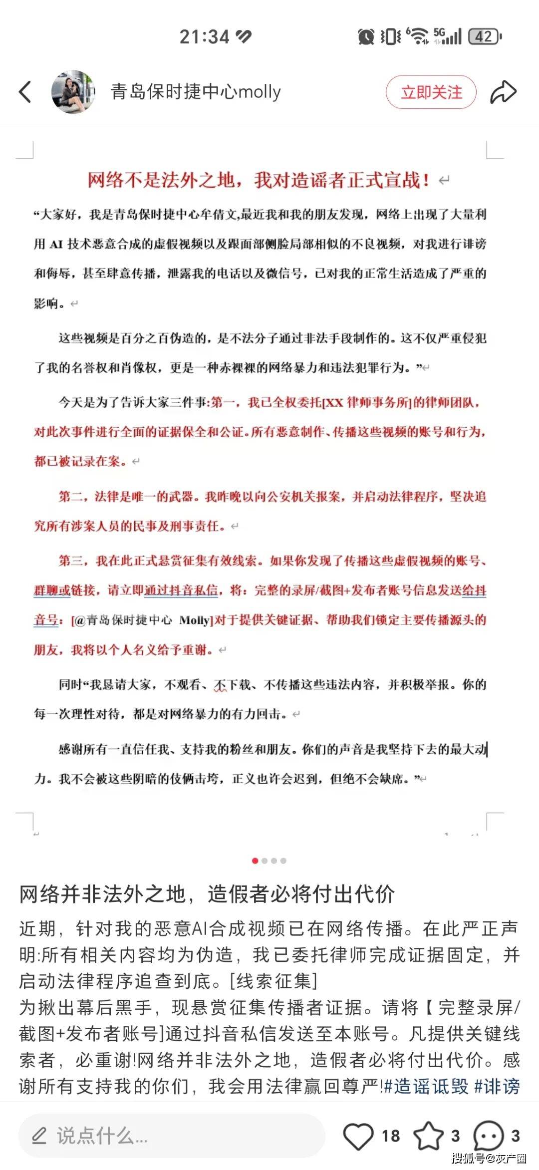 “昨晚,我已向当地公安机关报案,坚决追究所有涉案人员的民事及刑事责任,并悬赏征集有效线索。”她在文中呼吁,“我恳请大家,不观看、不下载、不传播这些违法内容,并积极举报。”