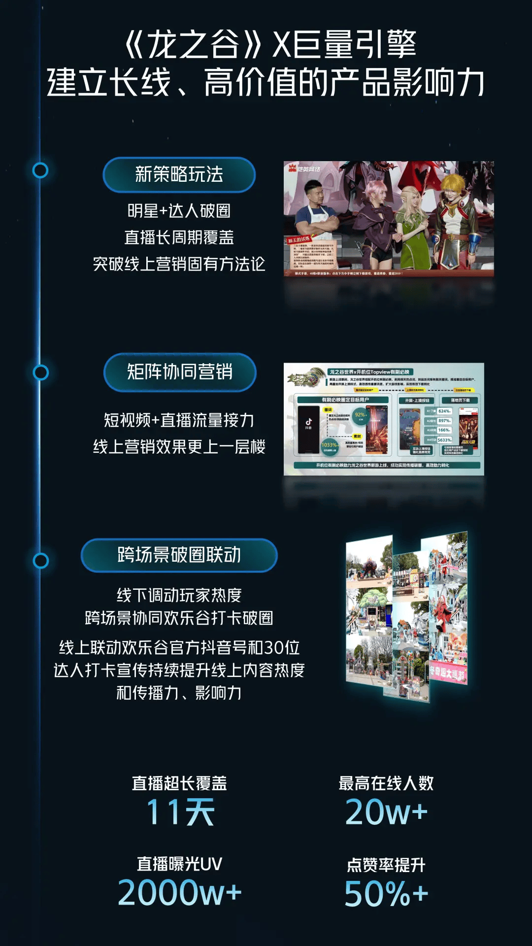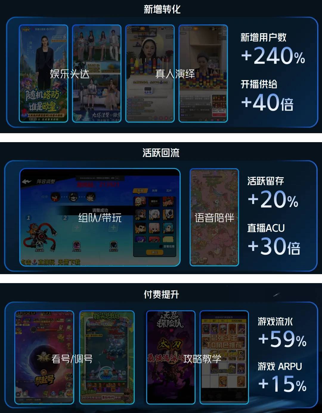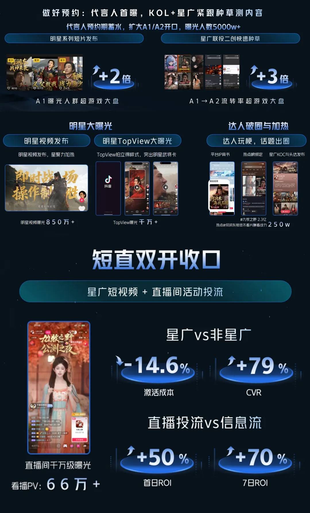 与此同时,面对行业普遍的素材荒、流量贵的痛点,星广联投通过平台机制高效撮合海量达人,生产出原生、可信的创意素材,其带来的用户ARPU值,平均比厂商自制素材高出30%以上。短引直模式则优化了直播转化路径,通过前端短视频进行情节化铺垫,再引流至直播间,实现了流量提升15%、互动提升63%、转化提升282%的链式增长。此外,直播作为占据76%独占人群的宝贵场景,其商业价值被深度挖掘,例如某游戏通过系统化提升直播渗透,最终实现了激活量提升85%与入付金额提升28%的双重突破。