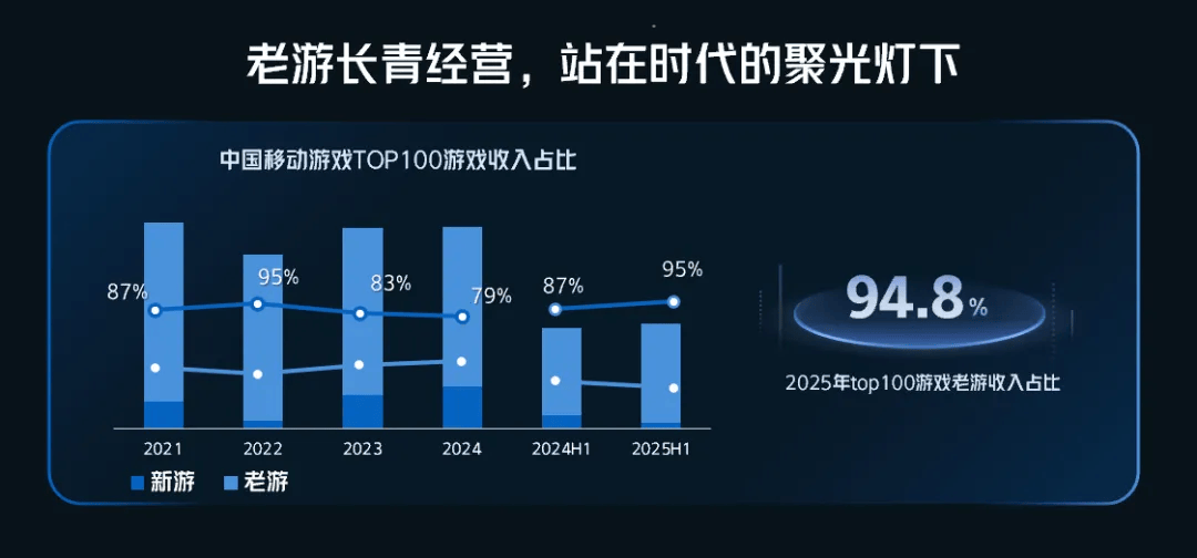2025年,游戏市场稳步增长背后,新品阵营爆款寥寥。iOS畅销榜前百位中,新游上榜数量与在榜时长双双下滑,而运营超五年的长青游戏却展现出强劲的营收活力,收入增速持续超越行业平均水平。根据伽马数据统计,2025年TOP100游戏中,老产品收入占比预计将高达94.8%,市场已由长青产品牢牢主导。在此结构性趋势下,抖音依托其覆盖全域的内容生态与商业体系,正无可争议地成为游戏行业实践长线经营的核心主场。