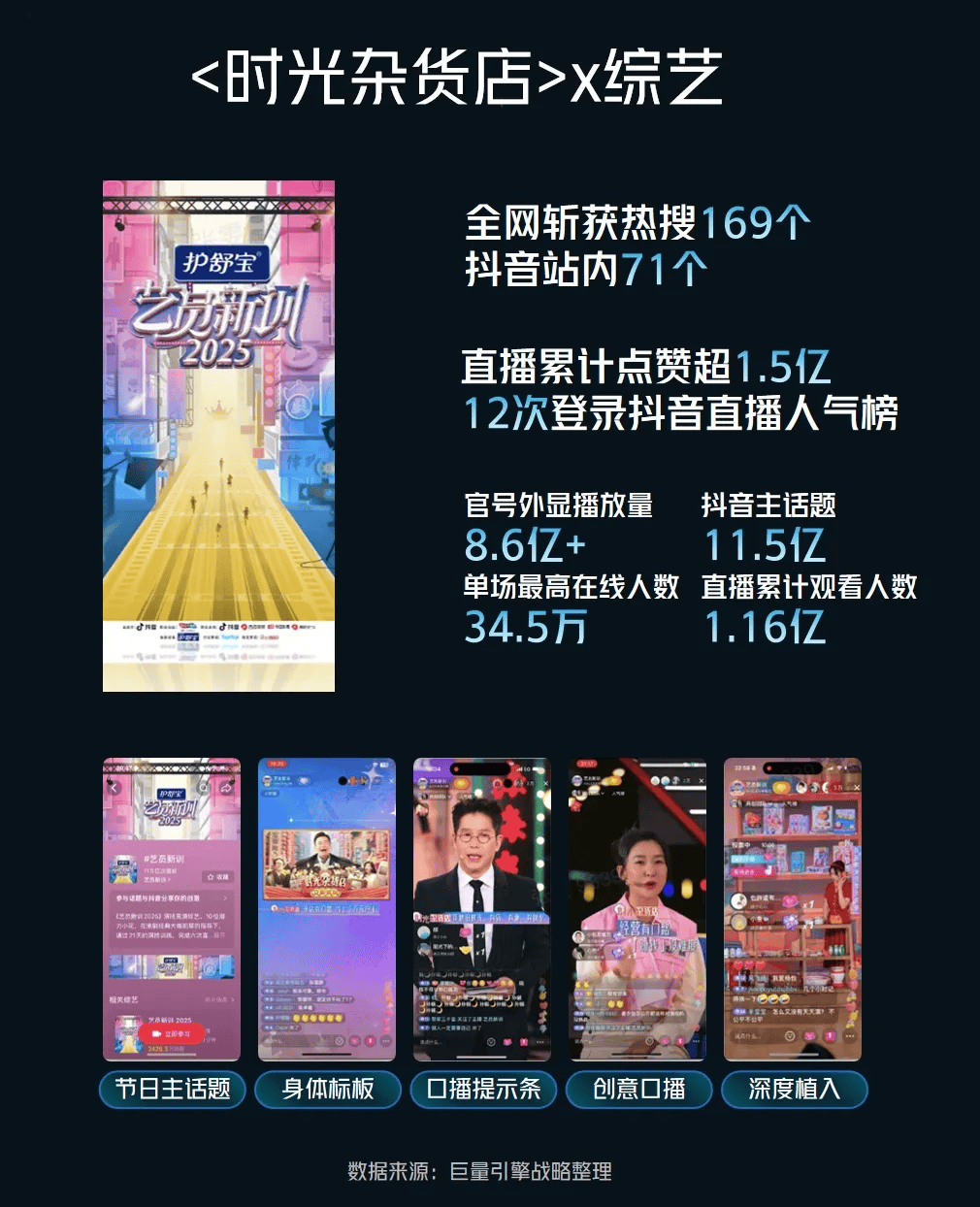 巨量引擎充分发挥平台娱乐资源整合优势,为游戏打造跨界传播事件。例如某游戏结合热门综艺主题深化玩法设计,全网累计登上热搜169次,实现直播观看量1.16亿、12次登顶人气榜,成功达成内容传播与用户增长的双重突破。