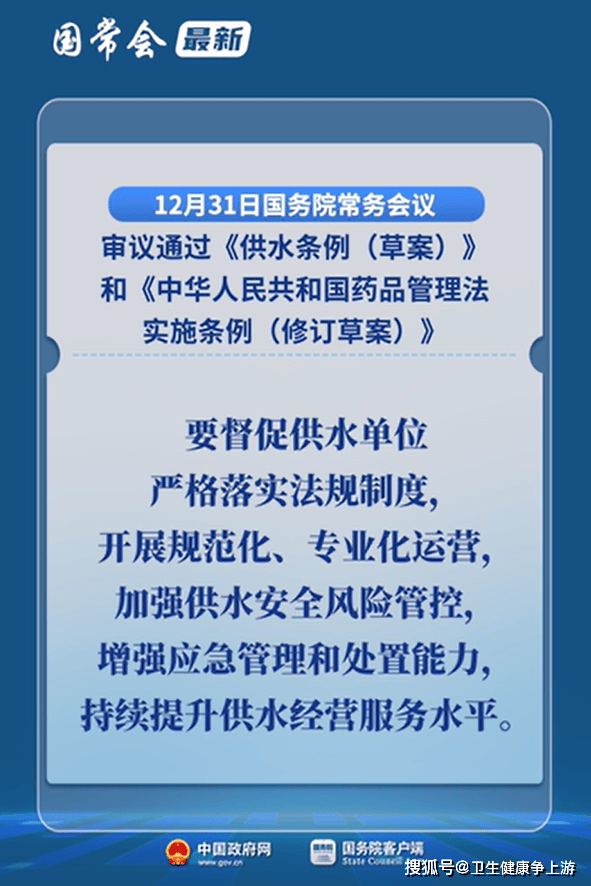 会议指出,供水事业是民生事业,关系千家万户。要坚持城乡统筹,促进城市供水和农村供水共同发展,着力构建从水源到水龙头的全链条规范体系。要因地制宜实现多水源互补,加力支持供水管网更新改造,做好调压调蓄等终端设施日常维护,确保水质安全。要督促供水单位严格落实法规制度,开展规范化、专业化运营,加强供水安全风险管控,增强应急管理和处置能力,持续提升供水经营服务水平。
