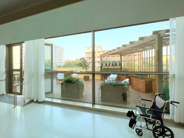 3. 设施优势:分区照护+智能设备,安全又安心占地约1万平米,五层建筑分区明确:一层综合服务区和社区食堂,二至三层失智照护专区,四至五层失能及高龄照护专区,实现“分类照护、精准服务”,避免不同需求长者相互干扰。房间配备护理床(带报警器)、智能床垫、智能制氧仪、智能马桶、一键式无线呼叫器等智能设备,实时监测长者身体状况,一旦出现异常,医护人员可快速响应。二楼还有1500平方米室外疗愈花园,适合长者户外休闲、康复锻炼,兼顾安全性与舒适性[3]。