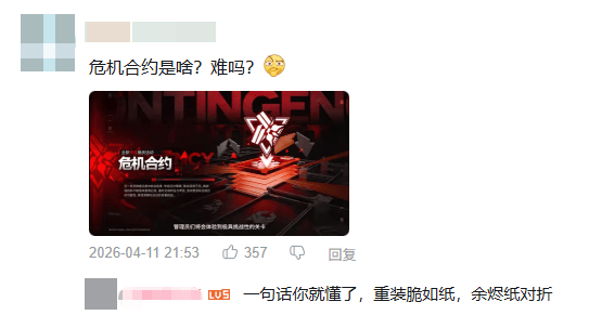 不过,要说这次版本最让人意外的,还不是上面这些,前瞻直播里,官方公布了未来将推出“危机合约”的消息,不夸张地说,这四个字出现的时候,整个直播间的弹幕直接炸了——前瞻回放视频累计1.6万条弹幕,估计有一半都挤在那几秒里。