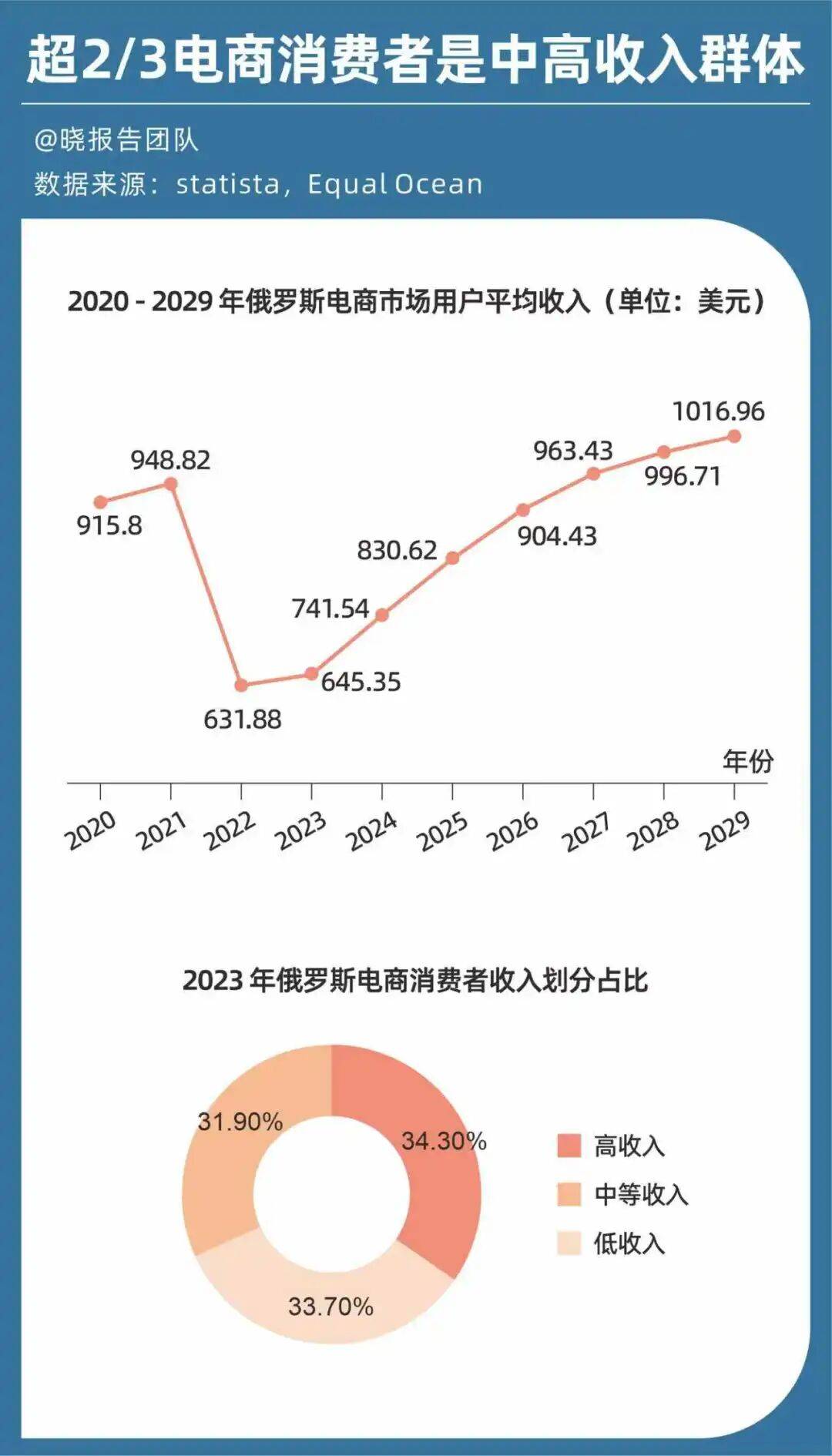 根据Equal Ocean数据,2023年俄罗斯平均月薪水平为62270卢布,约合人民币4981元;按收入划分,2023年俄罗斯电商市场中高收入消费者占比超过三分之二,其中高收入消费者占比34.3%,中等收入群体占比31.9%。