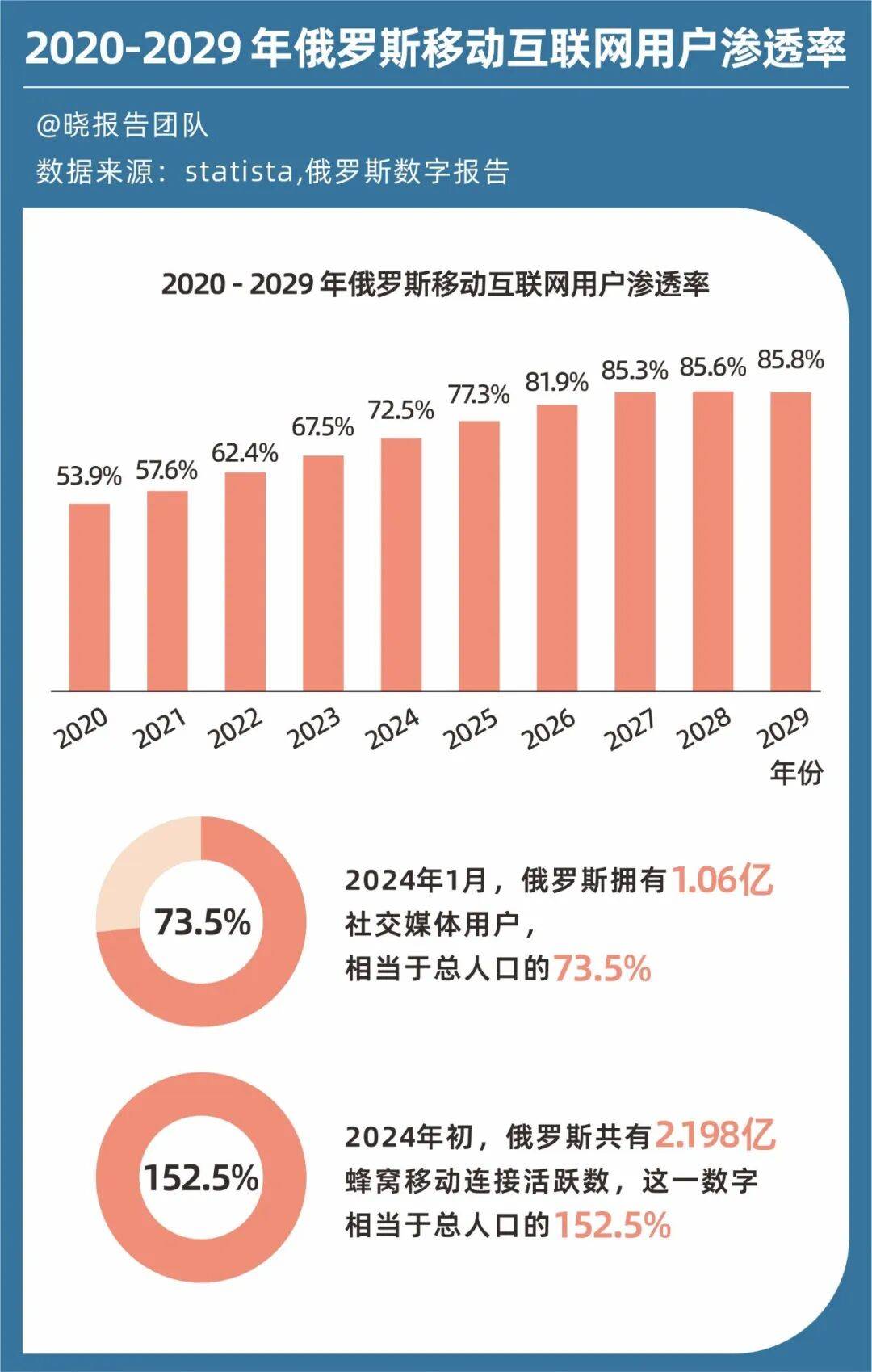 与此同时,这群人还爱活跃在社交媒体上,作为日常社交、信息获取和娱乐消费的核心渠道。数据显示,2024年初,俄罗斯共有2.198亿蜂窝移动连接活跃数,这一数字相当于总人口的152.5%。